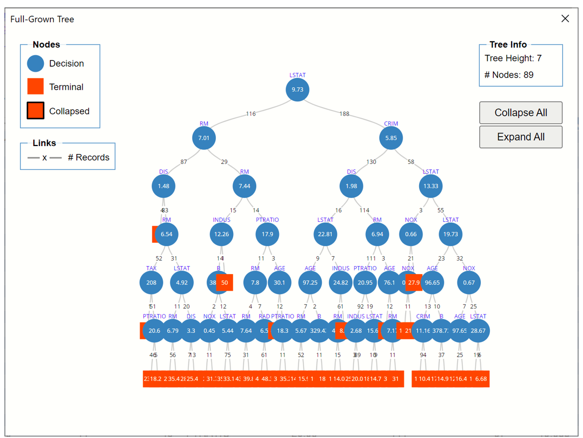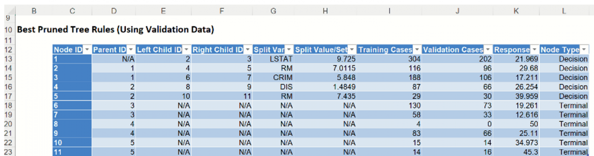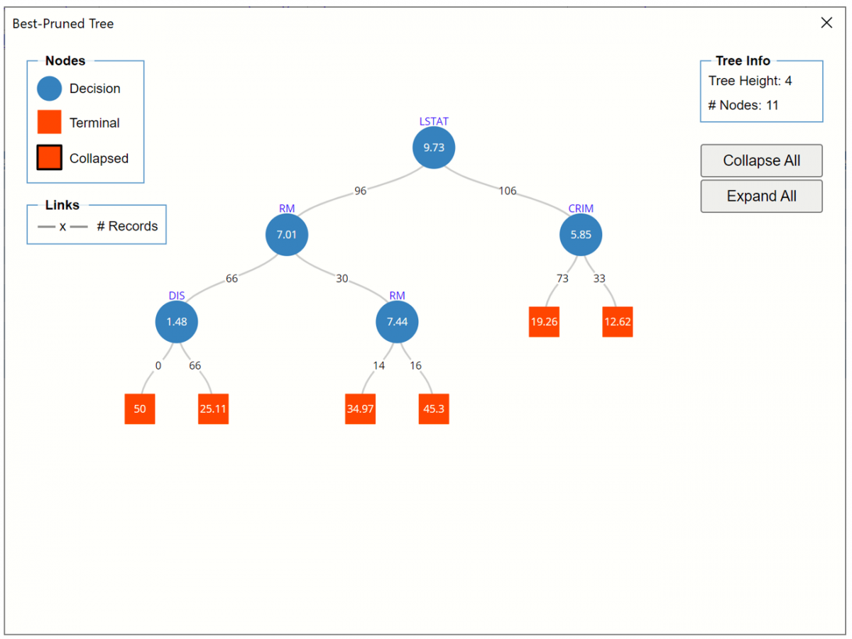 Analytic Solver Data Science chooses the number of decision nodes for the pruned tree and the minimum error tree from the values of Validation MSE. In the Prune log shown below, the smallest Validation MSE error belongs to the tree with 16 decision nodes (MSE=15.72).  This is the Minimum Error Tree – the tree with the smallest misclassification error in the validation dataset.  The Best Pruned Tree is the smallest tree with an error within one standard error of the minimum error tree.