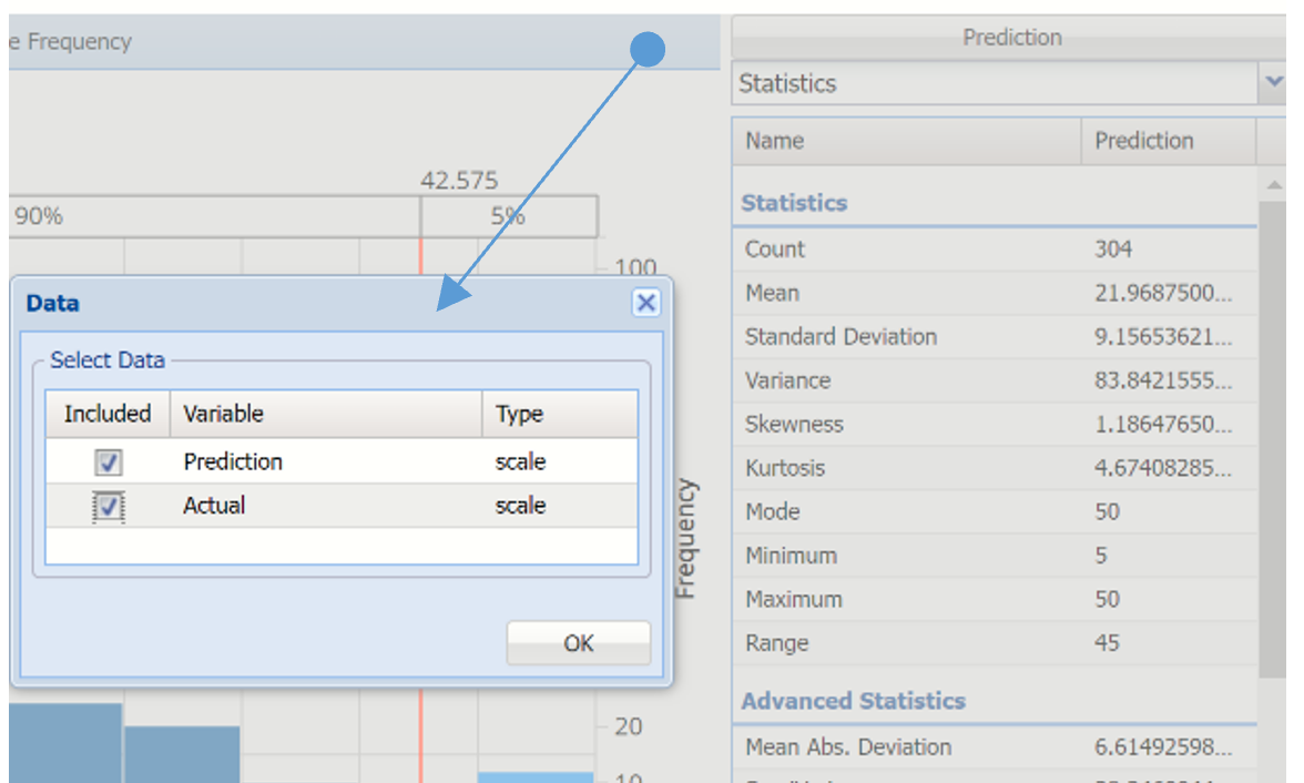 When Frequency Chart is selected, a frequency chart will be displayed when the RT_TrainingScore and RT_ValidationScore worksheets are selected.  This chart will display an interactive application similar to the Analyze Data feature, explained in detail in the Analyze Data chapter that appears earlier in this guide.  This chart will include frequency distributions of the actual and predicted responses individually, or side-by-side, depending on the user’s preference, as well as basic and advanced statistics for variables, percentiles, six sigma indices.
