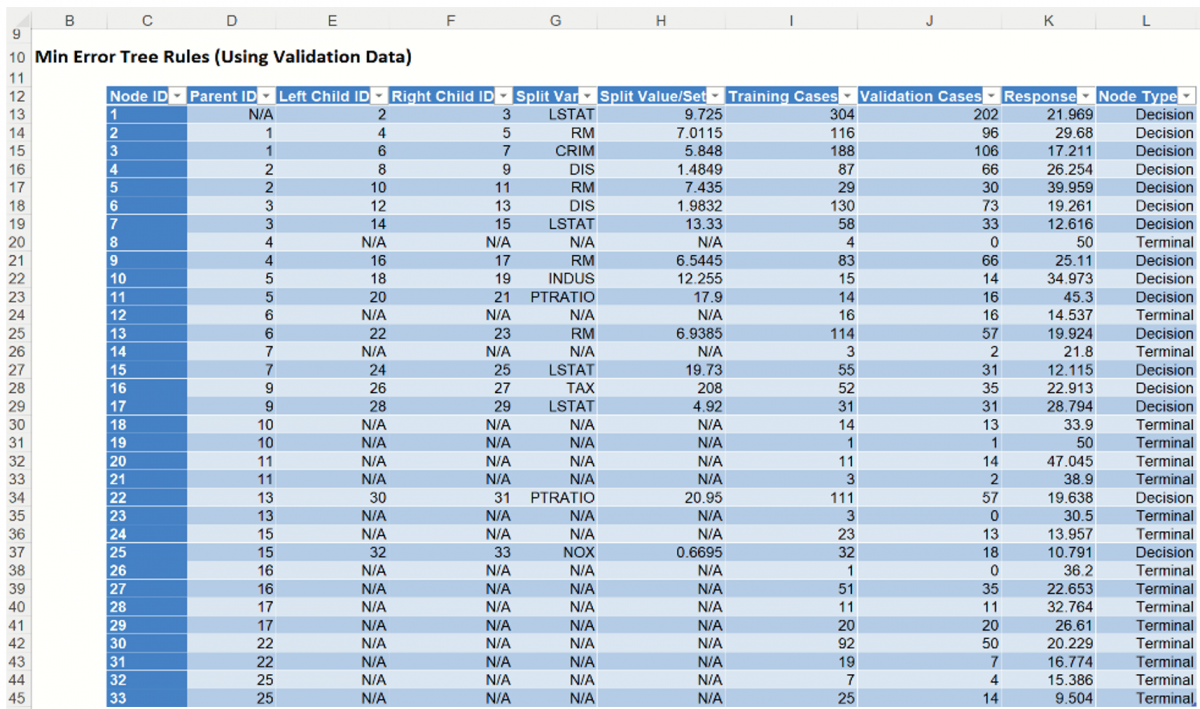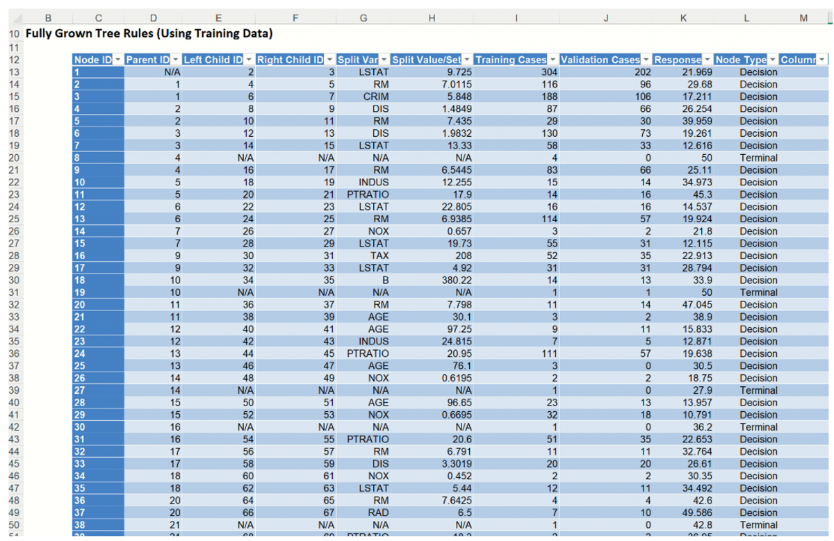 Output sheets containing the results for Regression Tree will be inserted into your active workbook to the right of the STDPartition worksheet.