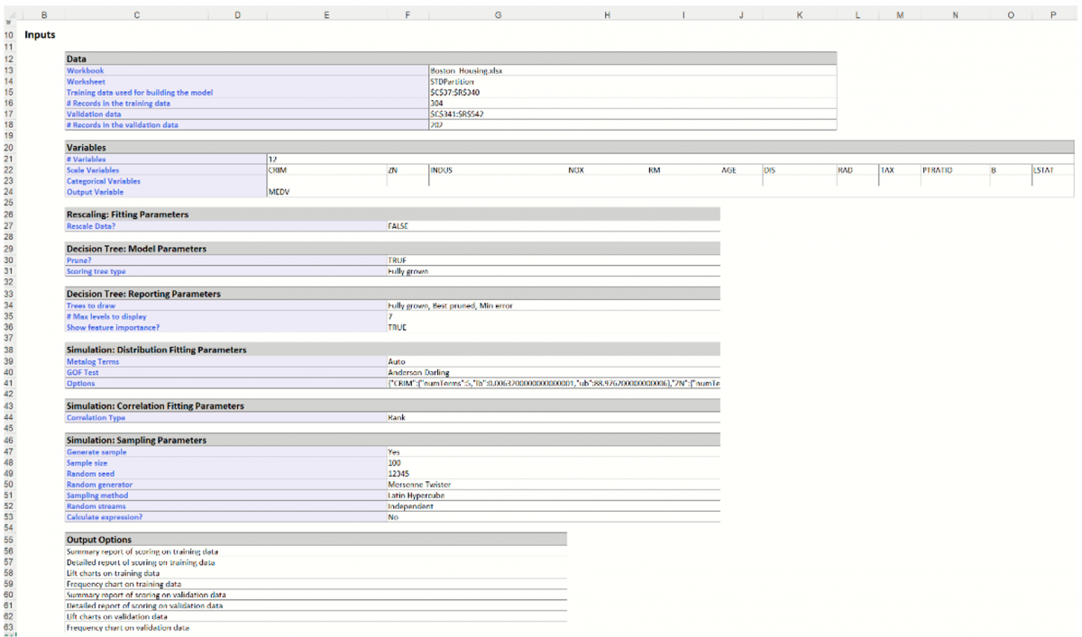 All supervised algorithms include a new Simulation tab.  This tab uses the functionality from the Generate Data feature (described in the What’s New section of th Data Science User Guide and then more in depth earlier in this guide) to generate synthetic data based on the training partition, and uses the fitted model to produce predictions for the synthetic data.  The resulting report will contain the synthetic data, the predicted values and the Excel-calculated Expression column, if present.  Since this new functionality does not support categorical variables, the CHAS variable will not be included in the model.