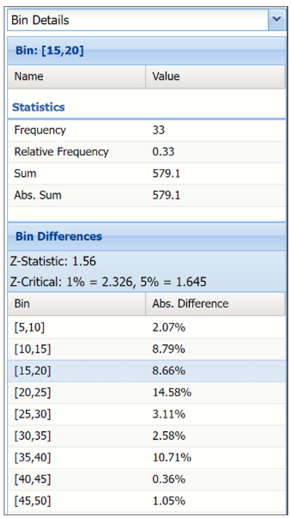 The Relative Bin Differences curve charts the absolute differences between the data in each bin.  Click the down arrow next to Statistics to view the Bin Details pane to display the calculations.