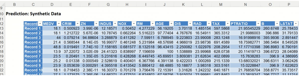 Notice in the screenshot below that both the Original and Synthetic data appear in the chart together, and statistics for both data appear on the right.  As you can see from this chart, the fitted regression model perfectly predicted the values for the output variable, MEDV, in the training partition.
