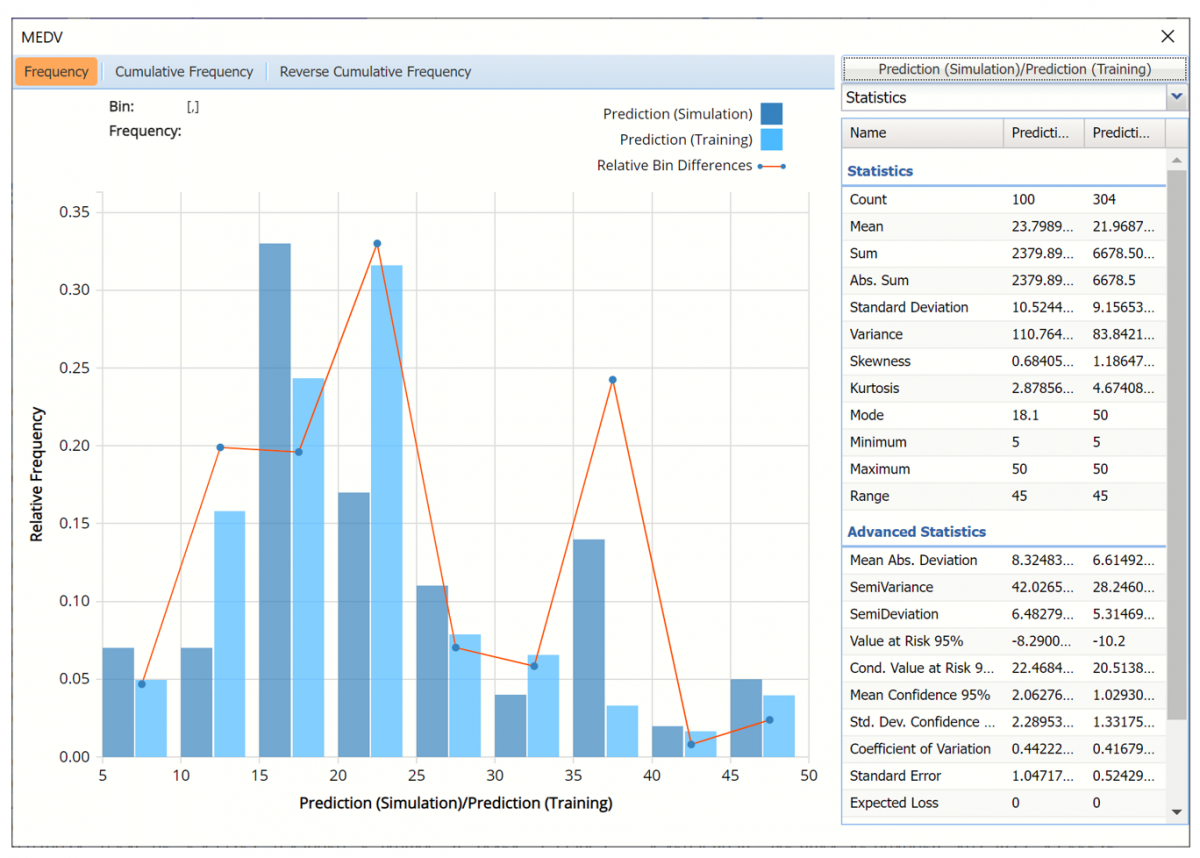 Simulation tab: All supervised algorithms include a new Simulation tab.  This tab uses the functionality from the Generate Data feature (described earlier in this guide) to generate synthetic data based on the training partition, and uses the fitted model to produce predictions for the synthetic data.  The resulting report, RT_Simulation, will contain the synthetic data, the predicted values and the Excel-calculated Expression column, if present.  In addition, frequency charts containing the Predicted, Training, and Expression (if present) sources or a combination of any pair may be viewed, if the charts are of the same type.