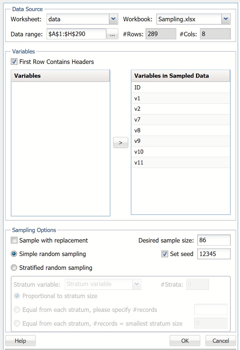 Click back to the data worksheet, select all variables from the Variables list, then click > to include them in the Variables in Sampled Data list. At Desired sample size, enter 86, and at Set seed, enter 12345. Select Stratified random sampling.