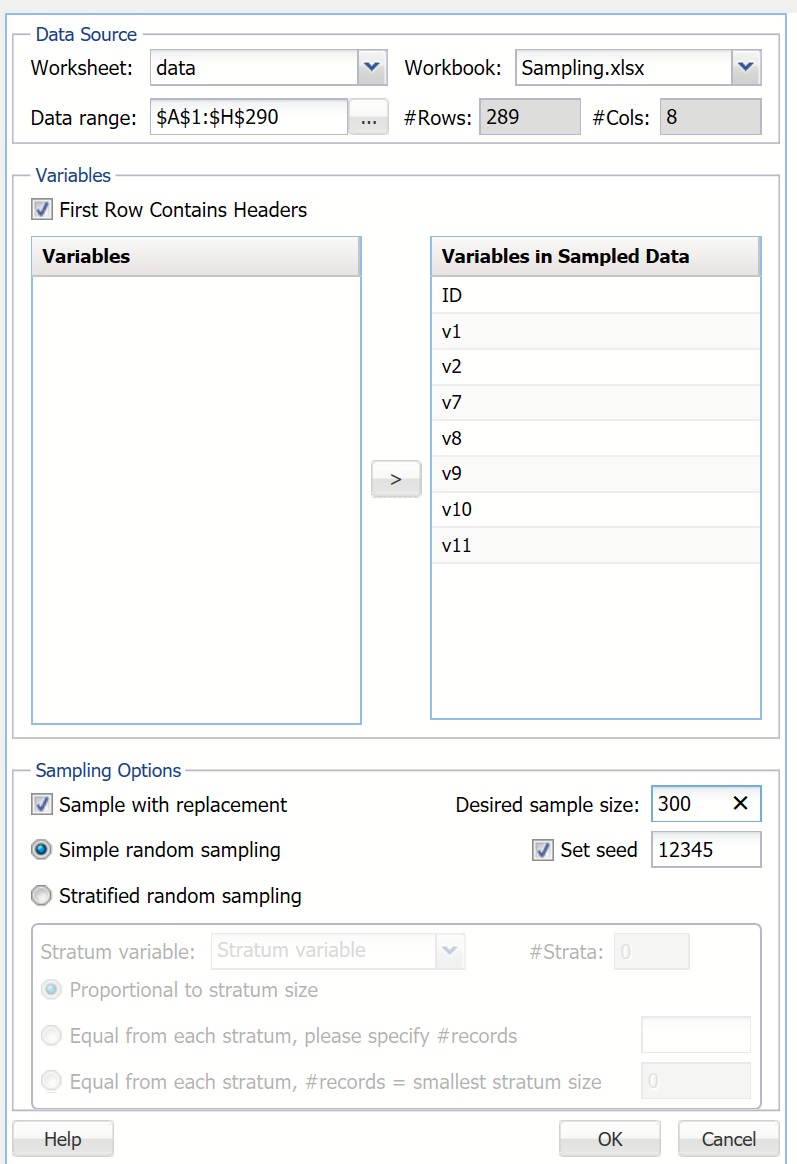 On the Analytic Solver Data Science ribbon, click Help - Example Models, and select Forecasting/Data Science Examples to open the data set Sampling.xlsx. This data set contains a variable ID for the record identification and seven variables, v1, v2, v7, v8, v9, v10, v11.