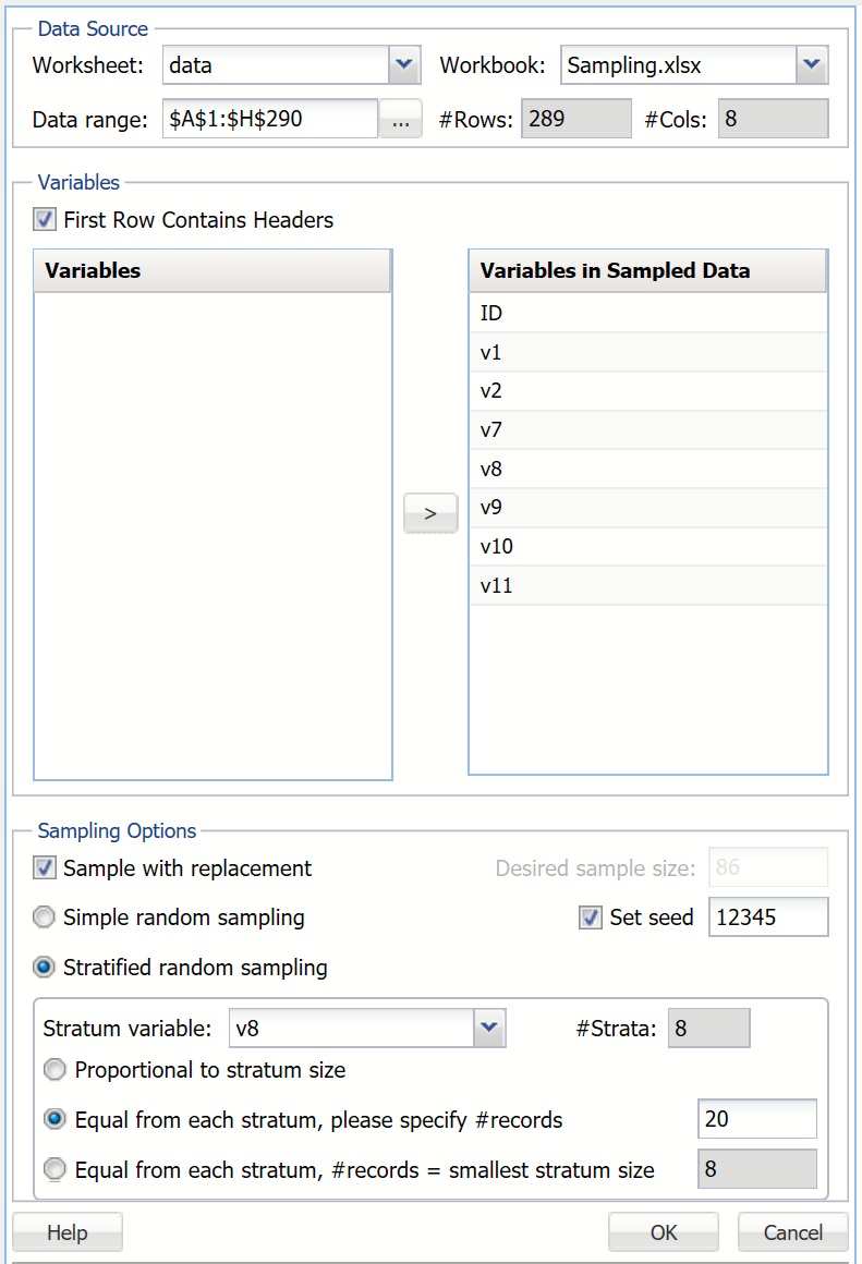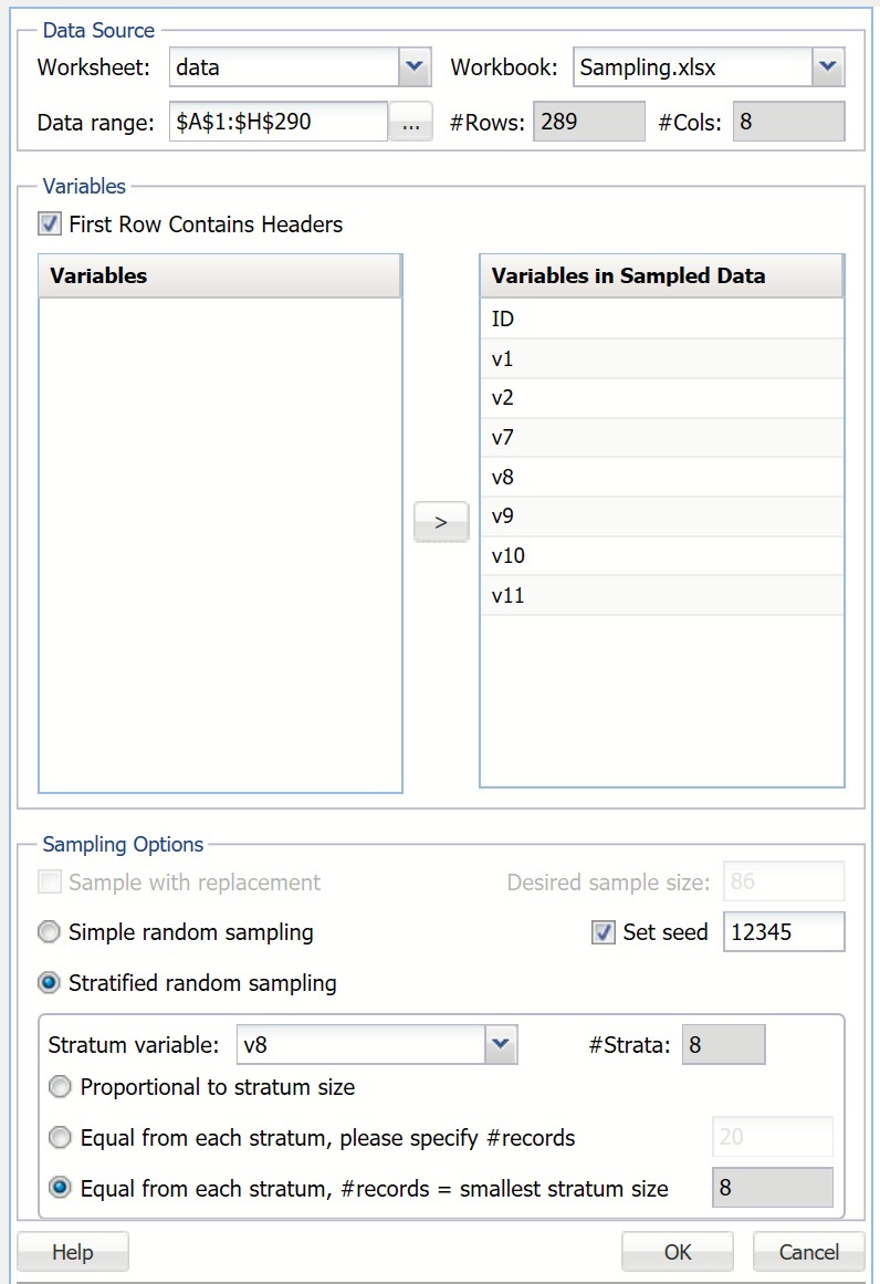 From the Variables list, select all variables and click > to include them in the Variables in Sampled Data list. Select Stratified random sampling. Select v8 as the Stratum variable. The #strata is displayed automatically. Select Equal from each stratum, please specify # records and enter #records. This number should not be greater than the smallest stratum size. In this case, the smallest stratum size is 8. (Note: The smallest stratum size is displayed automatically in the field next to the option Equal from each stratum, please specify # records.) Enter 7, which is less than the limit of 8, and then click OK.