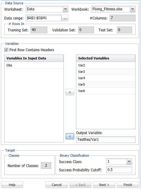 Enter a value between 0 and 1 here to denote the cutoff probability for success. If the calculated probability for success for an observation is greater than or equal to this value, than a success (1) will be predicted for that observation. If the calculated probability for success for an observation is less than this value, then a non-success (0) will be predicted for that observation. The default value is 0.5. This option is enabled when the number of classes for the output variable is equal to 2.
