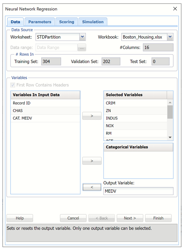 Place categorical variables from the Variables list box to be included in the model by clicking the > command button. The Neural Network Regression algorithm will accept non-numeric categorical variables.