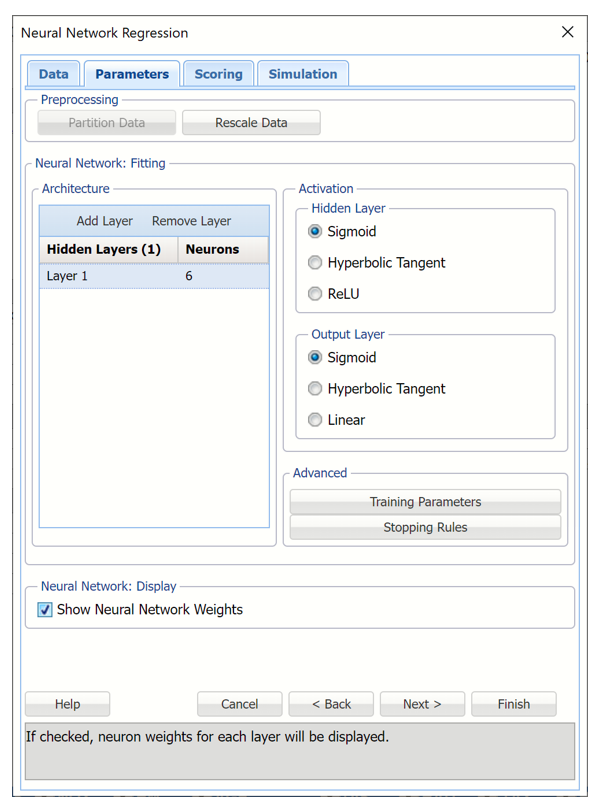See below for options appearing on the Neural Network Regression - Parameters dialog. Note: The Neural Network Automatic Regression - Parameters dialog does not include Architecture, but is otherwise the same.