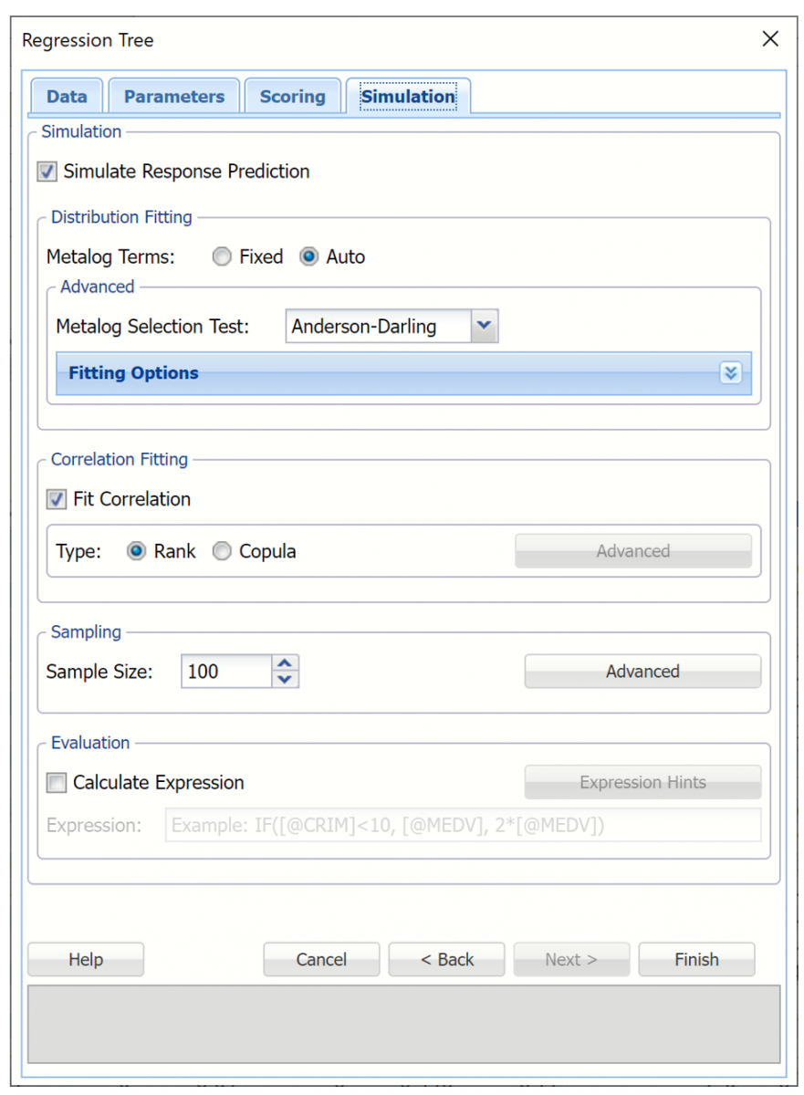 Evaluation: Select Calculate Expression to amend an Expression column onto the frequency chart displayed on the RT_Simulation output tab. Expression can be any valid Excel formula that references a variable and the response as [@COLUMN_NAME]. Click the Expression Hints button for more information on entering an expression.