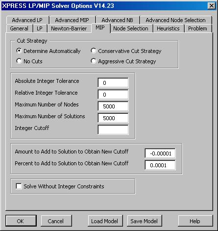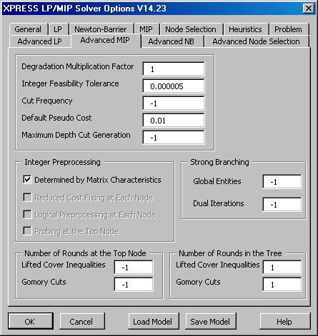 The XPRESS Solver Options dialog Advanced MIP tab allows you to set advanced options that control the Branch and Cut method. The default values are often useful, but may be changed for specific problems to improve performance. |