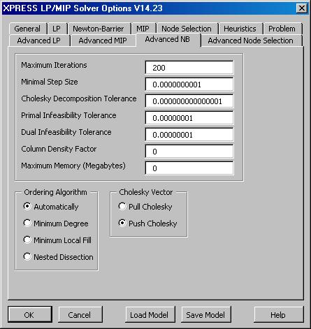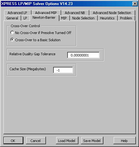 The XPRESS Solver Options dialog Advanced Newton Barrier tab allows you to set advanced options that control the Newton Barrier method. The default values are appropriate for most problems, but these options can be adjusted by advanced users. |